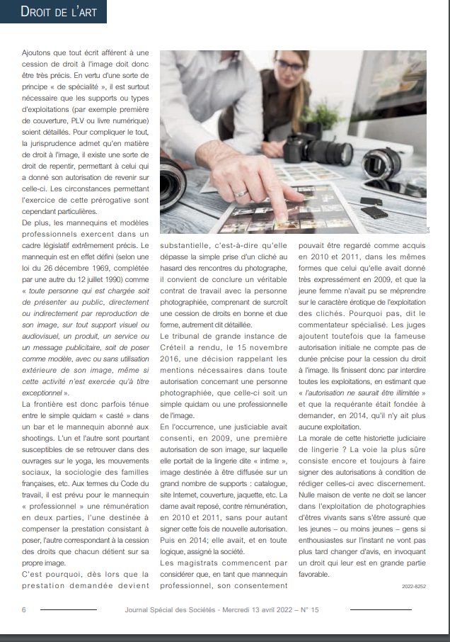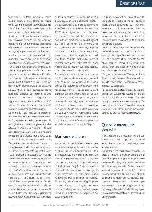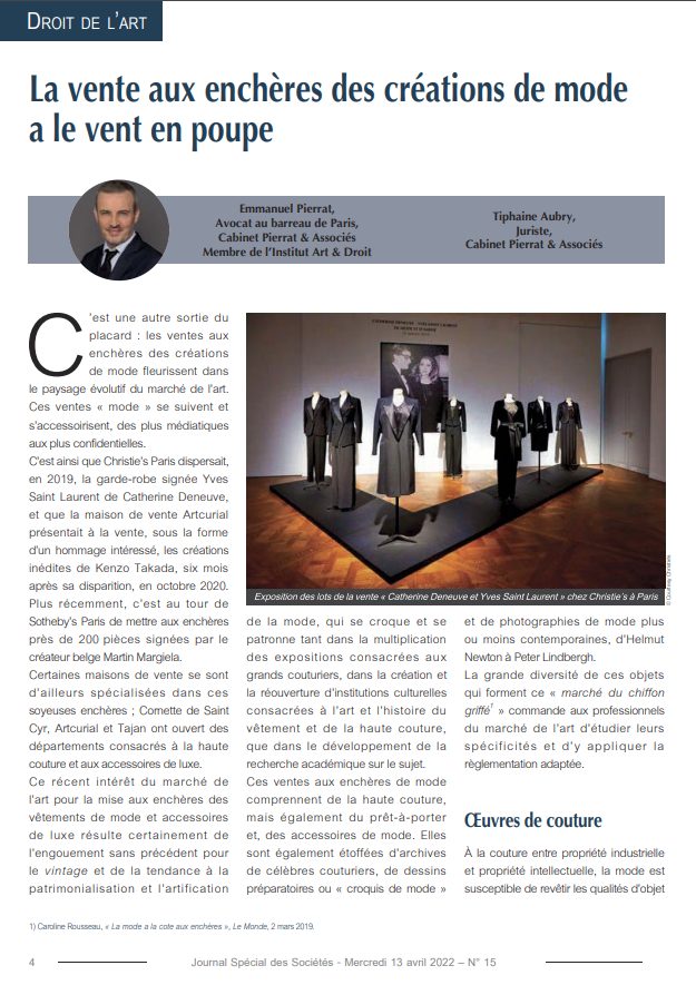Découvrez l’article d’Emmanuel Pierrat intitulé « La vente aux enchères des créations de mode a le vent en poupe » co-écrit avec la juriste Tiphaine Aubry, paru à l’occasion du dossier « L’année 2021 en droit de l’art : Un bon Millésime ! » du JSS Journal Spécial des Sociétés.