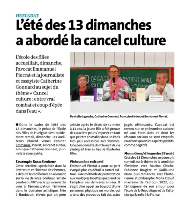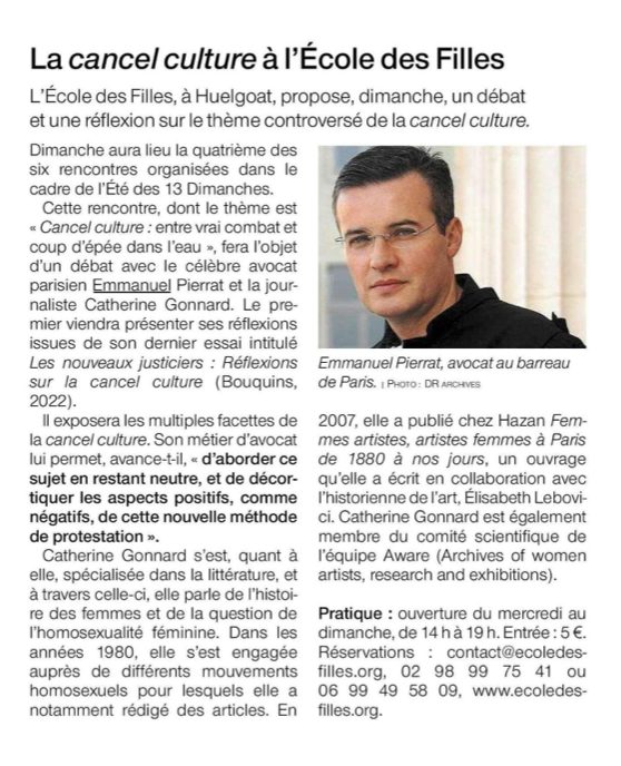 Dimanche 21 août, Emmanuel Pierrat a débattu de la « Cancel Culture » aux côtés de la journaliste militante Catherine Gonnard, et sous la tutelle de la galeriste et modératrice Françoise Livinec, qui l’invite pour la troisième fois à l’École des filles de Huelgoat, au cœur du Finistère.