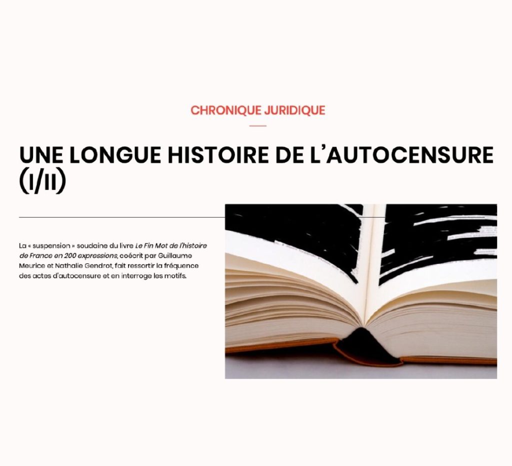 Allez lire la nouvelle chronique juridico-culturelle d’Emmanuel Pierrat, disponible sur le site de Livres Hebdo, en cliquant ici. La soudaine suspension du livre « Le Fin Mot de l’histoire de France en 200 expressions », coécrit par Guillaume Meurice et Nathalie Gendrot, est l’occasion pour lui d’évoquer la question de la liberté d’expression et celle […]