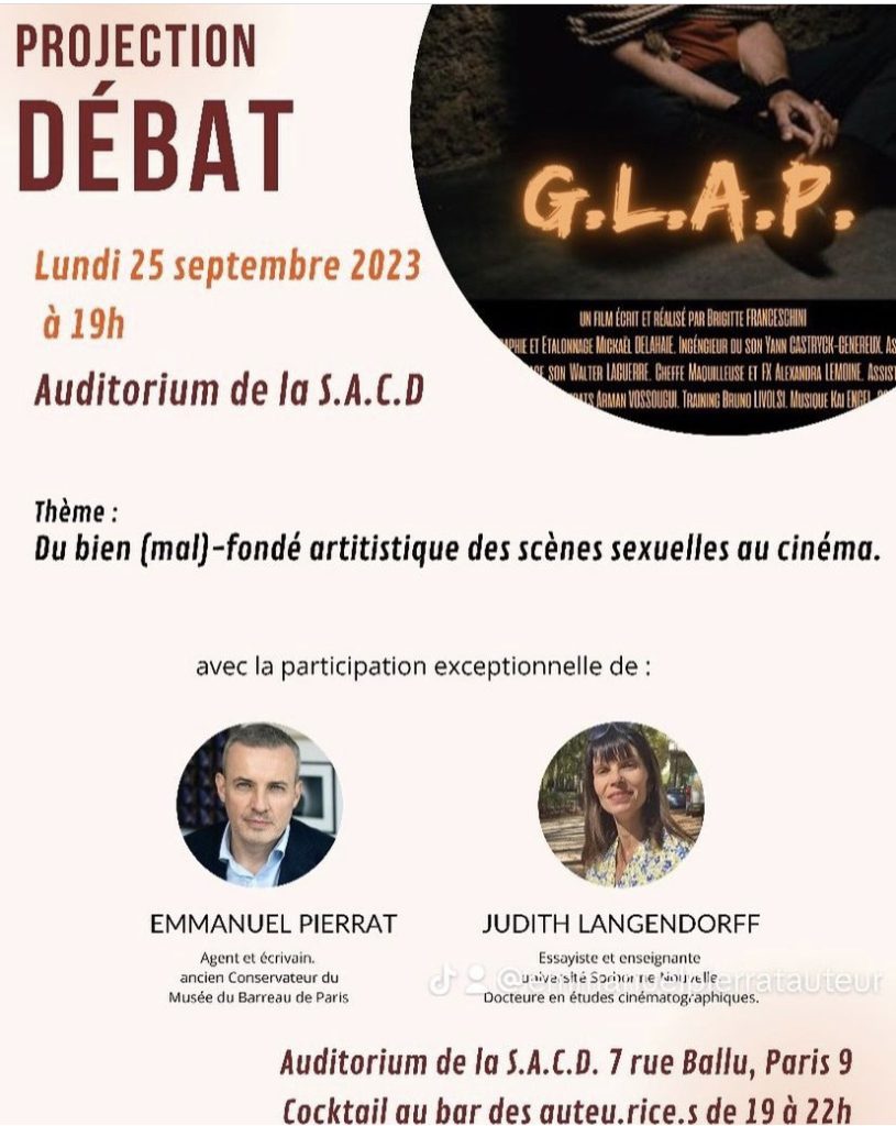 Lundi 25 septembre au soir, Emmanuel Pierrat débat à la SACD avec l’essayiste et enseignante en cinéma Judith Langerdoff et la réalisatrice Brigitte Noble. Le débat sera sur le film de cette dernière, « G.L.A.P. » et le « bien (mal)-fondé des scènes sexuelles a cinéma ».