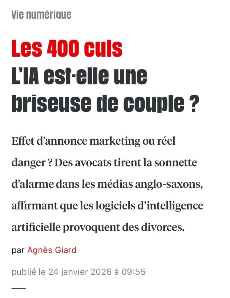 Agnès Giard a interrogé Emmanuel Pierrat pour sa passionnante chronique hebdomadaire « les 400 culs », publiée dans Libération, à propos des supposés divorces provoqués par l’IA… À lire ! https://www.liberation.fr/lifestyle/hightech/lia-est-elle-une-briseuse-de-couple-20260124_4CZOOL2BSZG2FBLSZP7TWY6MIU/ #avocat #divorce #lesexeetlaloi #droitdelafamille #intelligenceartificielle